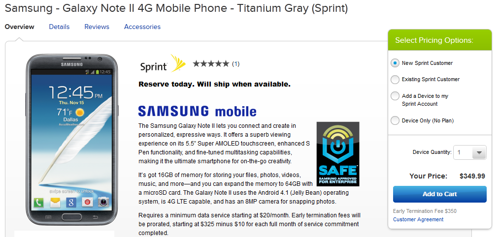 But you need to be alert because some of the pre-sale prices on the Best Buy Mobile eBay site are not exactly what the carrier's own website shows. Sprint is offering the Samsung GALAXY Note II for $299.99 while Best Buy Mobile has the pre-sale price listed as $349.99. After the 25% off the incorrect higher price, you would pay $262.50 for the phablet versus the $225 that you should be paying based on the correct price on Sprint's website. That is a difference of $37.50 that you are overpaying.