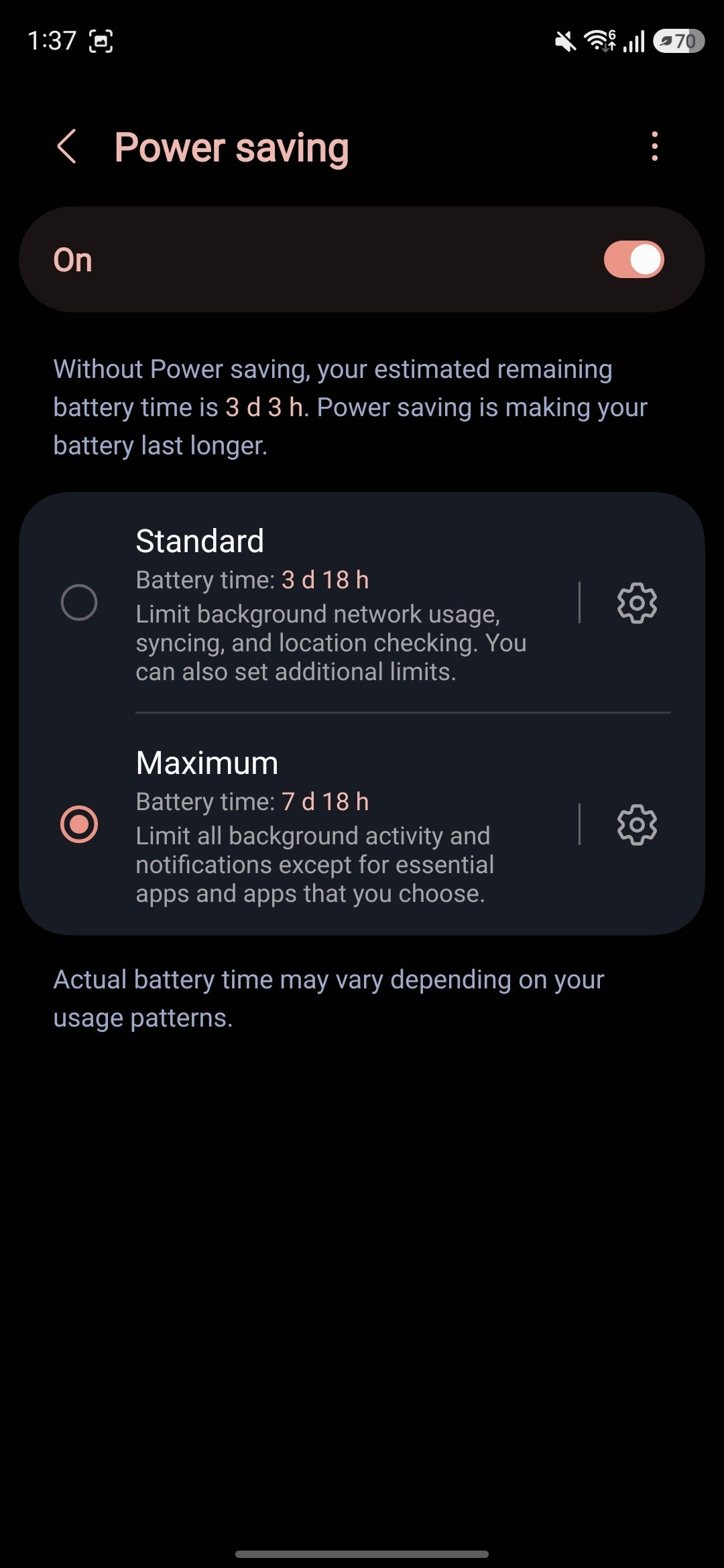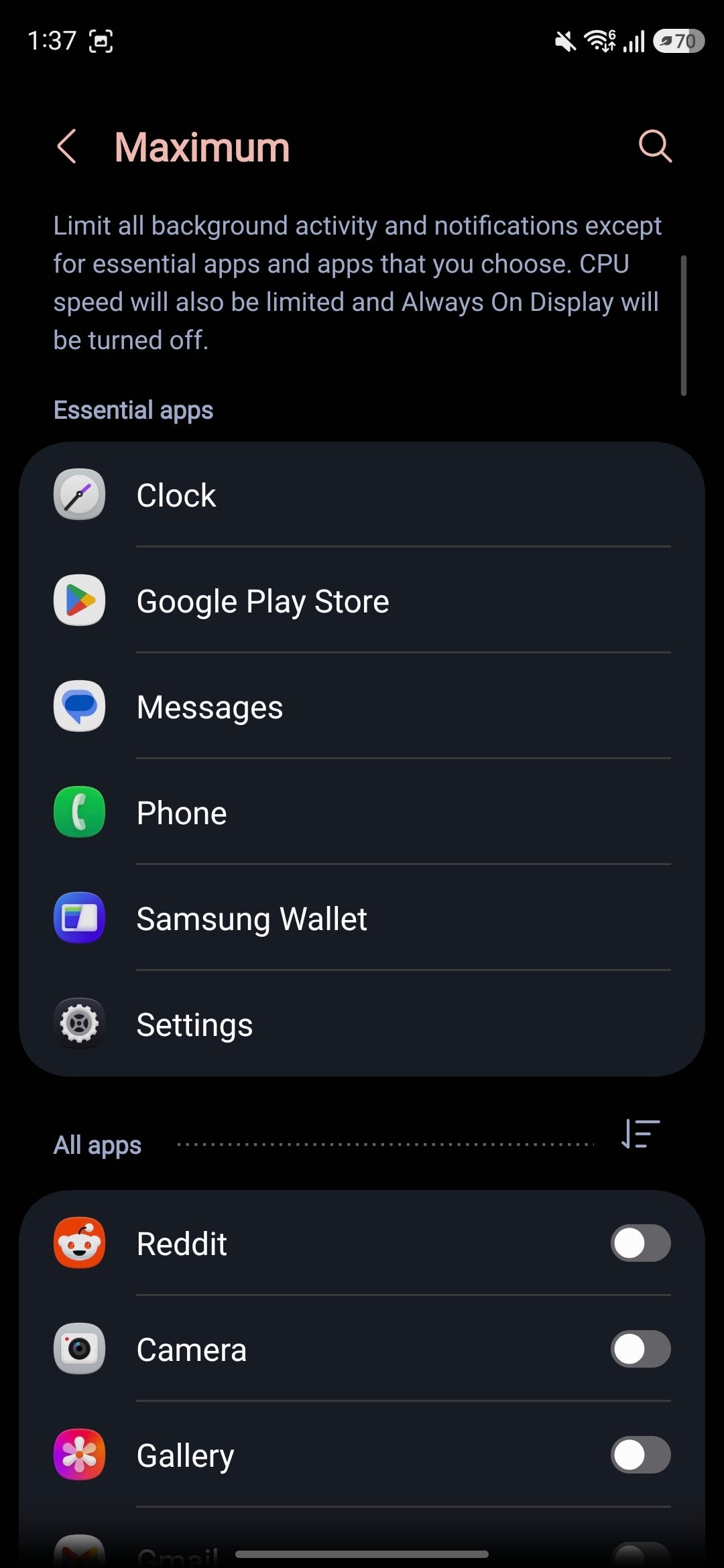 But there's also an even stricter maximum battery saver mode, which disables all background app activity and notifications except for the essential apps and the ones you whitelist. This battery saver mode also limits maximum CPU speed and turns off Always On Display.