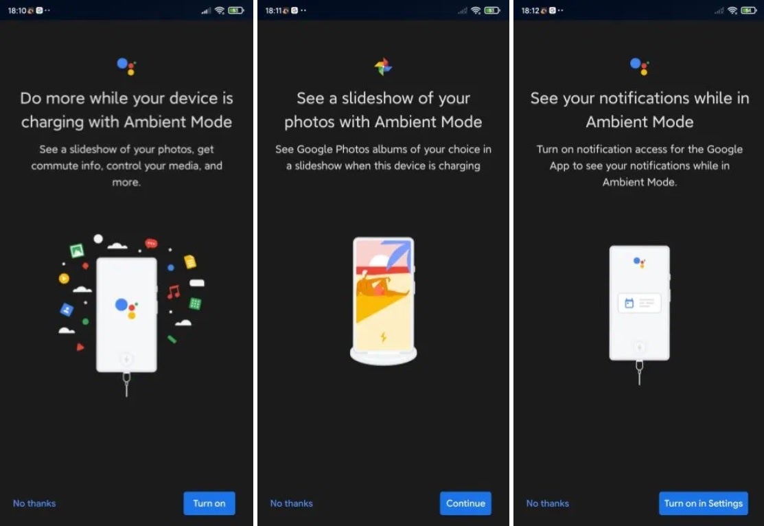 Ambient Mode will eventually be available on phones running Android 8.0 and higher. Google will let you know when it arrives on your device by showing you some pages containing some of the mode's features along with prompts allowing you to turn it on.