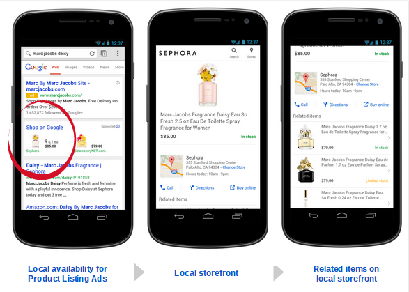 Updating the search results for a specific product, Google has tried to localize the shopping experience with Google Shopping. Enter the name of a product and you might find an ad from a local merchant. The ad might have a link to the retailer's website where you can look at the product before visiting the actual store. On Google's commerce blog, they give an example of how someone looking at some fragrance might find a link to a local store where he can check pricing, availability, see similar items, get the hours of the brick and mortar store, and call it if necessary.