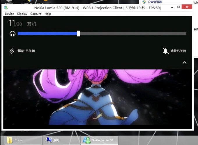 3. Hook up your handset to your computer via the microUSB cable, and fire up the MyProjectionClient executive. You should be able to see your phone when you click on the "Device" menu in the opened client, and tell the software what to record. At this time, a prompt on your Windows Phone device will appear, asking you for permission to record the phone's screen. Tap "Yes" on the phone's prompt;
