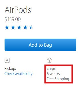 Shipping times for AirPods have not improved since their launch