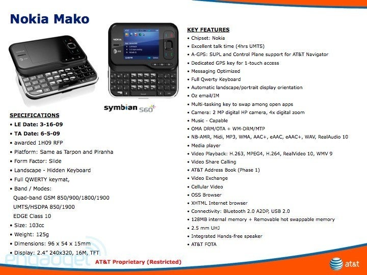 We will try to keep this simple – the Nokia Mako is a side-slider, which looks really interesting and quite futuristic. It has a four-row QWERTY and 2.4-inch QVGA resolution screen. It is a S60 3.2 smart phone and the most notable features are its 2MP camera, AGPS and dual-band HSDPA. The indicated release date is June 5; however, the source presumes that isn’t quite likely.