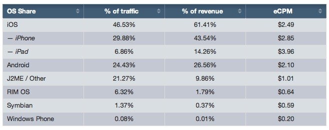 Besides OS, other factors determine if an ad will be effective. Large sized touchscreen models fared better in Opera's research while interactive ads outperformed ads requiring no viewer action. The Apple iPhone had the largest share of mobile ads, accounting for 43.54% of revenue and a 29.88% share of traffic. Android devices were next with 26.56% of revenue and 24.43% of traffic. But the most profitable device turned out to be a tablet, the Apple iPad with a eCPM of $3.96. Apple's tablet accounted for 14.26% of revenue and 6.86% of traffic.