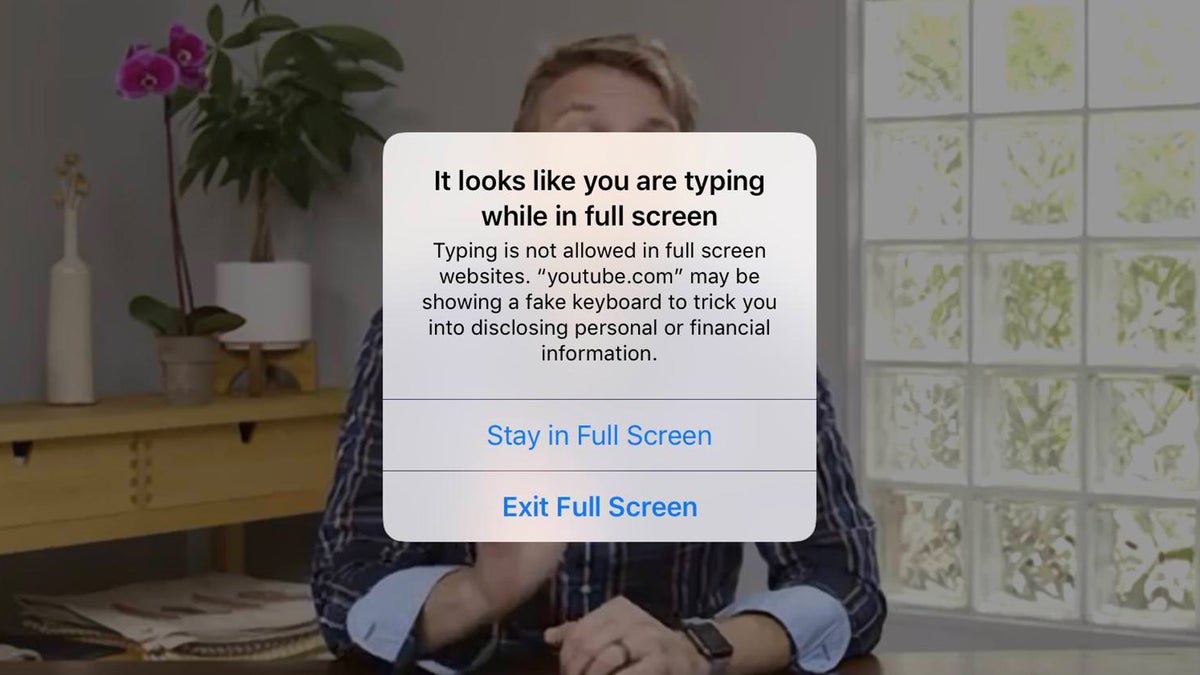 To simulate the feature, open YouTube.com in Safari, start up the video and go into fullscreen mode, then try to tap the screen as energetically as you normally interact with the iOS keyboard. If you do everything correctly, a message similar to the one below should pop up, warning about the potential scam. Of course, since we are visiting a reputable website and there's been no fullscreen keyboard present, you are safe to dismiss this message, but it should really come in handy if you're browsing somewhat shady websites that could harm you buy stealing your data. Hopefully, you will never have to get warned by this message again, but it definitely acts as a reaffirming piece of mind.