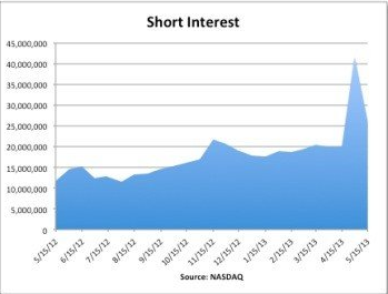 You know how stock market investors like to buy low and sell high? Selling short is the opposite. You borrow shares from your broker and then sell them. With this strategy, you want the stock to drop because it allows you to buy back the shares you've borrowed at a lower price. And yes, the shares do need to be bought back eventually. In fact, there is a famous saying relating to shorting. "He who sells what isn't his'n, must buy it back or go to prison." Hey, we only report these things, we don't make them up! Short interest in Apple rose from 8 million shares in April 2012 to 20 million by April 2013. During the last two weeks of April, when the shares fell sharply to $385, the short interest doubled to 41.6 million shares. Now, with the stock back up to the $445 area, the short interest has declined to 26 million shares. This means that the recent bounce off the low has been due to shorts covering their position which is not considered having the stock in the hands of strong buyers.
