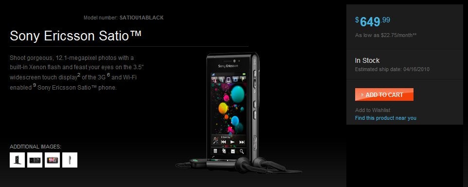 If you decided to wait a tad longer to see the Sony Ericsson Satio land in the US market, then you have to look no further than the Sony Style store to grab yourself this multimedia packing smartphone. Even though you could've purchased the same handset back in January for about the same price, we'd suspect more people would be inclined in purchasing it directly from Sony as opposed to some third party vendor – which is quite understandable. By dishing out a hefty $649.99, you can have yourself an unlocked version of the Sony Ericsson Satio which features a stunning 12-megapixel camera, Wi-Fi, Bluetooth, and the much desired compatibility for AT&T's 3G bands. Although T-Mobile customers can still go ahead and purchase the handset, they won't be as fortunate as those 3G riding AT&T customers that'll have support faster data connections. There's no denying the fact that it's one expensive puppy when you consider the sheer amount of other handsets you can purchase for the same amount of money, but being the only one in your block, and possibly town, could make it an attractive device no matter what.