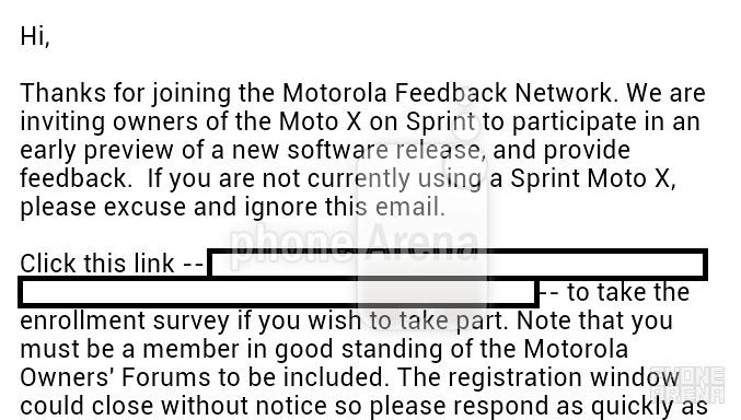 One of our loyal readers, who happens to be a Sprint customer, has just sent us a screenshot from his Motorola Moto X. An email he received from Motorola invited him to take part in a soak test for an upcoming software update. Considering that Verizon, AT&T and T-Mobile customers with the same device have already received Android 4.4, it wouldn't be a stretch to consider that this soak test is leading up to the KitKat update for the phone on the nation's third largest carrier.
