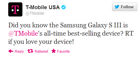 A tweet from the nation's fourth largest carrier has announced that the all-time best-selling device in the history of T-Mobile is...the Samsung Galaxy S III. Does this come as a surprise to anyone? After all, the phone had already sold over 20 million units in its first 100 days. Perhaps the only surprising thing, which is also quite impressive, is that the phone has been on the market for less than four months. The actual date that it became available to T-Mobile customers was June 21st of this year.