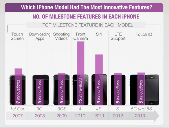There are usually less than 10 worthy new features from one iPhone to its "s" version the next year, as you can see in the chart above (hit the infographic link below for the exhaustive list of those). The biggest upgrade count was from the iPhone 4 to the 4s, which saw nine innovations introduced, compared to the predecessor, both hardware and software ones. How many novelties does the iPhone 6s introduce compared to the iPhone 6? Let's do a bit of counting, and by no means is this an exhaustive list.