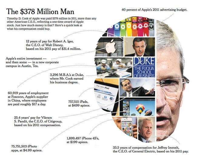 The CEO's 2011 salary of $900,000 would make most of us very happy, but is below the median pay for a CEO in the States which is a whopping $14.4 million. With other compensation, the Apple CEO took home $1.8 million in 2011. Including the stock award, Cook is the