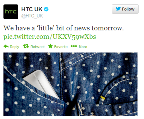 Oh HTC, thanks for sending that tweet on Wednesday (actually, it came from HTC's U.K. office). Yes, we got the point immediately about the 'little' bit of news that you are going to send our way on Thursday. In addition, the image of the phone in the pocket would at first blush appear to be the HTC One, but the placement of the black dot on the back is on the wrong side. Plus, we get the idea of the phone fitting easily into a pocket.