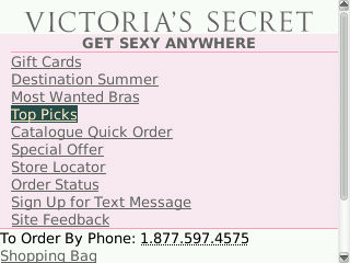 It´s been brought to our attention that Victoria's Secret has launched a dedicated mobile web site. Now, this might not seem like a major story compared with the news we see about touch and 'Berry's and articles about models where we give a hands-on review. Actually, the website (mobile.victoriassecret.com) does serve a purpose as it allows retail customers to shop for lingerie and garments while on the go. We can see how this has a great appeal to, say, the busy female executive who wants to buy something special for the evening she has planned with her significant other. After a long day at work, it's much easier to shop online than to get in the car and drive over to the store, fighting traffic both on the road and at the mall. Functionally, the site works like most other retail web outlets, featuring different categories and shopping bags. The main menu even gives you a list of the "Most Wanted Bras". Gift cards can be easily purchased and you can even get the location of the nearest store to your home or office just in case you are the type who likes trying things on for size before purchasing. Another feature allows you to sign up to receive texts directly from the company. While women will most probably like the web site because it brings the whole shopping enjoyment to their cell phone screens, the pleasure a man can derive from Victoria's Secret mobile site is ... self explanatory.