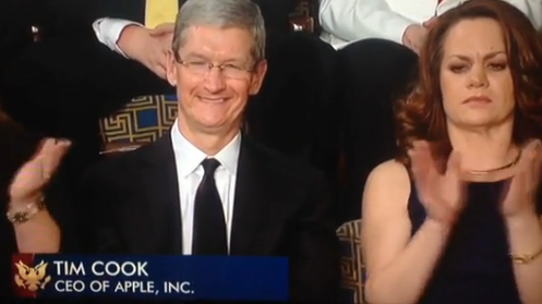 What has the president talking about Apple is the latter's decision to move some of its Mac production to the United States from overseas. And by the way, guess who is in the audience watching President Obama? Why it's none other than Apple CEO Tim Cook who managed to wrangle up a cheap seat from Bob Uecker was invited by the First Lady to see the State of the Union live. Maybe she was angling for a free Apple iPad.