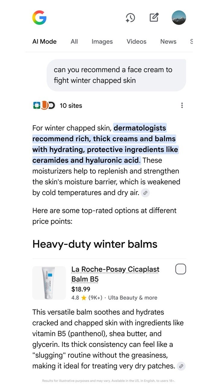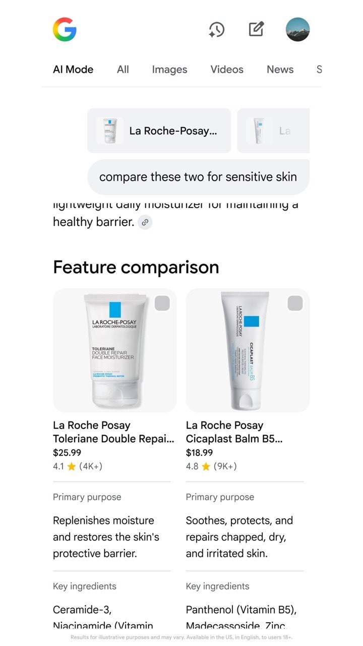 For starters, they're making shopping in Search (in AI Mode) more conversational. The idea is you can ask for vague things just like you would a friend, and it will serve up shoppable images and even side-by-side comparison tables for things like moisturizers. This is also coming directly to the Gemini app, pulling info from Google's massive Shopping Graph.