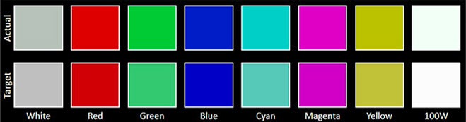 The Color accuracy chart gives an idea of how close a display's measured colors are to their referential values. The first line holds the measured (actual) colors, while the second line holds the reference (target) colors. The closer the actual colors are to the target ones, the better.