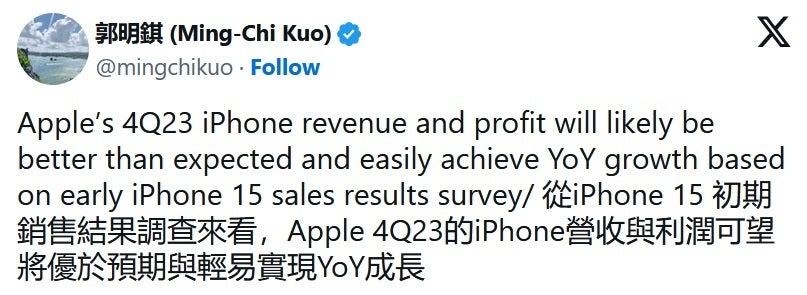 It has been 11 days since Apple unveiled the iPhone 15 series, eight days since it started taking pre-orders, and one day since the phones were released. To find out how the process is going thus far, we turn to TF International's world-famous Apple analyst (at least among phone enthusiasts) Ming-Chi Kuo. In his latest written report, Kuo says that things are going so well that Apple's fiscal Q4 iPhone revenue and profits will both be better than expected.