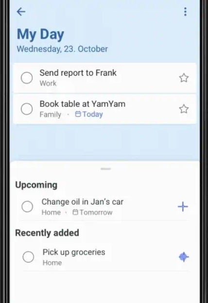 The My Day screen for the Microsoft To Do app gets your day off to a more productive start by suggesting and recommending tasks