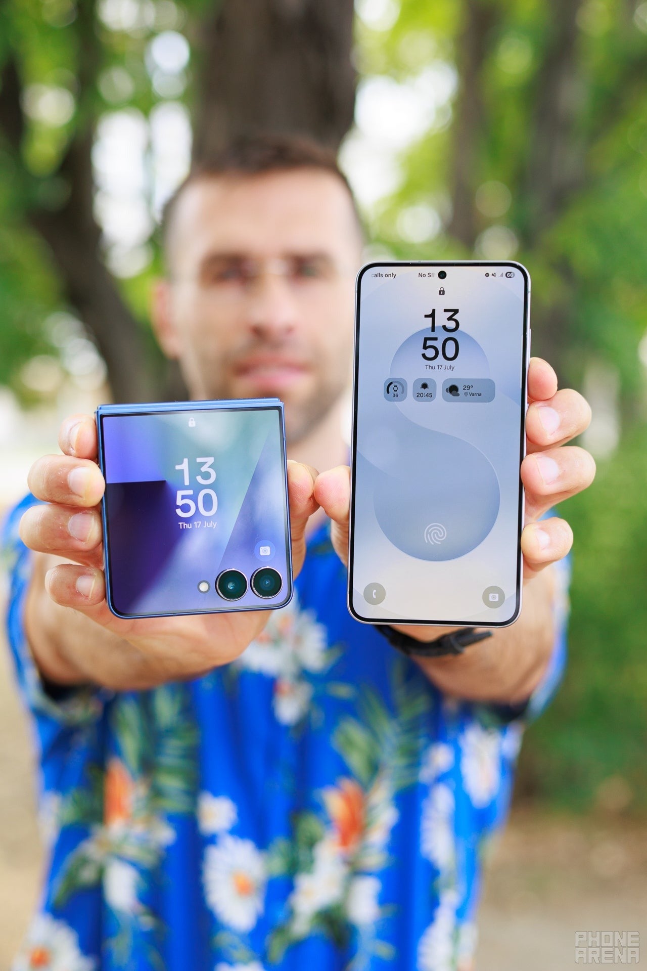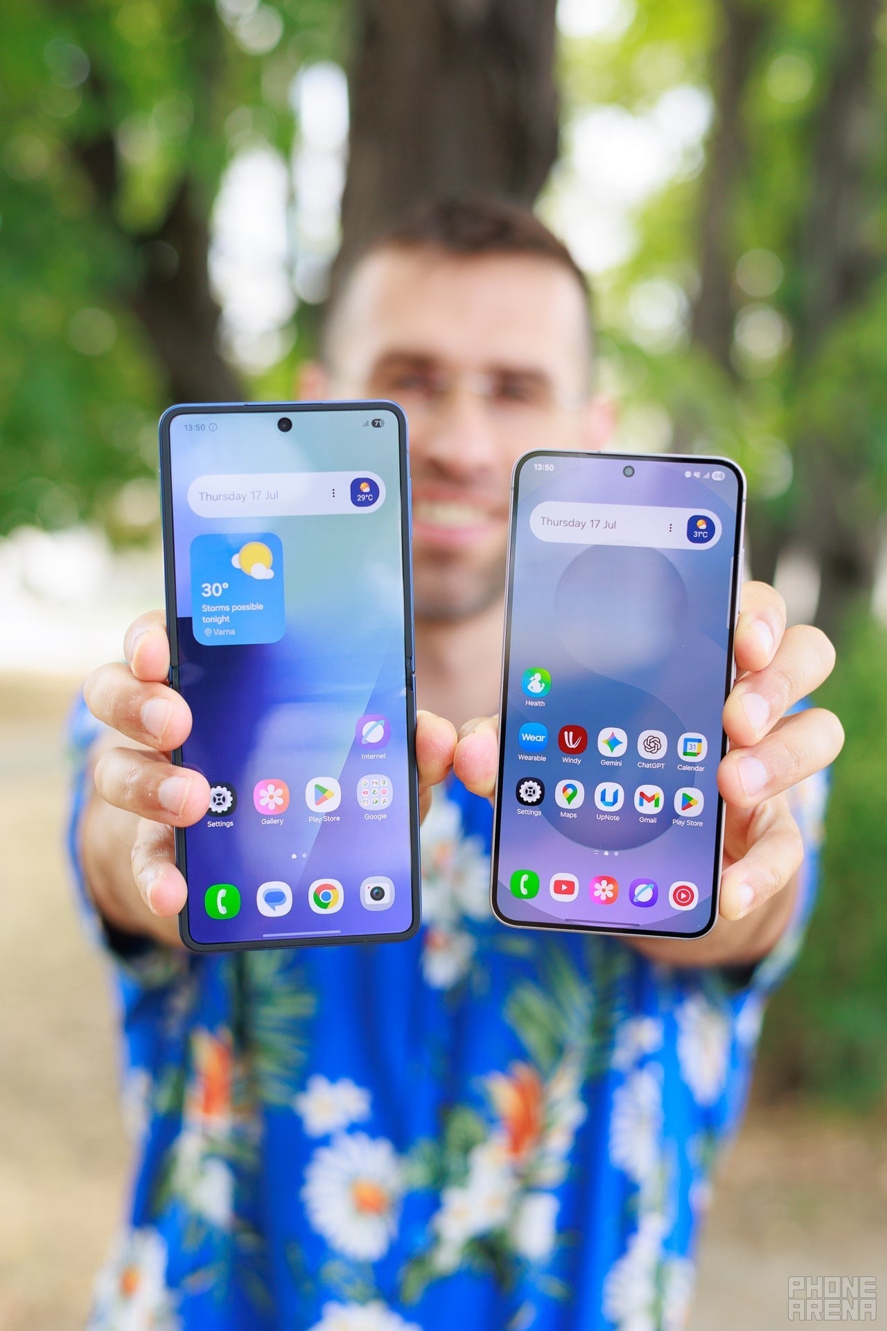 Folded Galaxy Z Flip 7 on the right and the Galaxy S25 on the right. | Image by PhoneArena