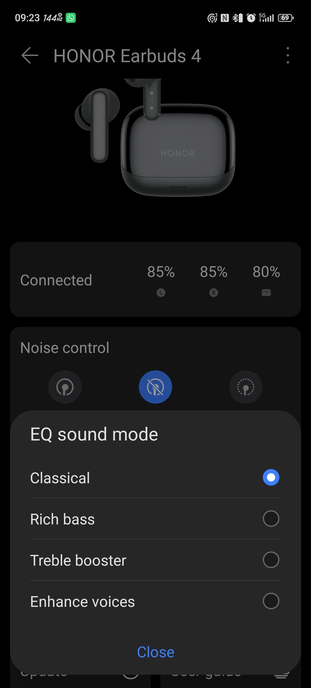 But on the other hand, this is a small price to pay, as in this setting the Honor Earbuds 4 sound pretty amazing. I'd say on par with much more expensive earbuds. There are four EQ settings as well (sadly, no customizable EQ) — Classic, Rich Bass, Treble Boost, and Voice Enhance. The first one is the most balanced, but in all fairness, there's not a night and day difference between all of them.