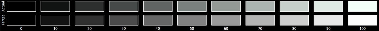 The Grayscale accuracy chart shows whether a display has a correct white balance(balance between red,green and blue)across different levels of grey(from dark to bright).The closer the Actual colors are to the Target ones,the better.