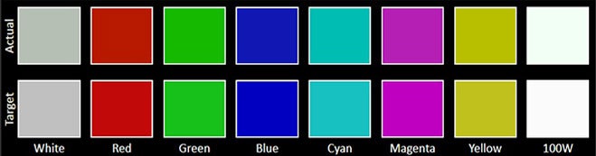The Color accuracy chart gives an idea of how close a display's measured colors are to their referential values. The first line holds the measured (actual) colors, while the second line holds the reference (target) colors. The closer the actual colors are to the target ones, the better.