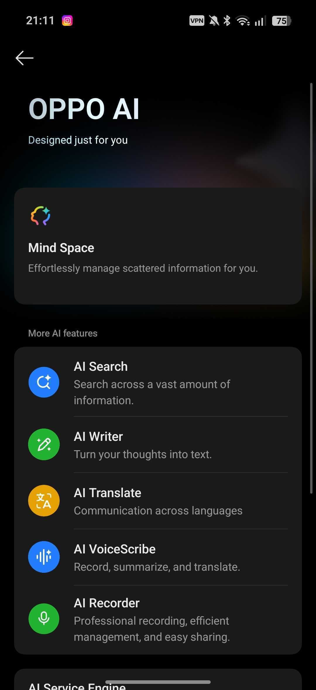 Oppo AI consists of a few useful modules. There's a rather useful AI search feature that lets you scour through the Settings menu with natural language, as well as other on-device content like documents, notes, and calendar events. There's also the rather standard AI writer, which is yet another take on the paraphrasing AI tool we've seen countless times. There's an AI recorder that creates a live transcription of your voice notes, and a pretty self-explanatory AI Translate feature.