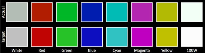The Color accuracy chart gives an idea of how close a display's measured colors are to their referential values. The first line holds the measured (actual) colors, while the second line holds the reference (target) colors. The closer the actual colors are to the target ones, the better.