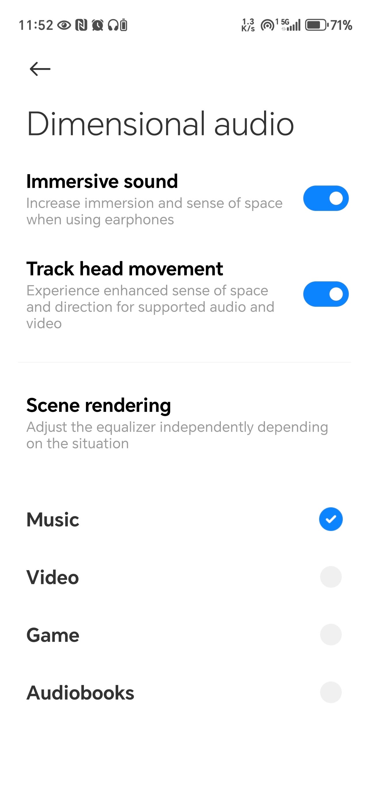 Dimensional Audio has two subcategories—Immersive Sound and Track Head Movement. The former makes the sound more focused, and it emulates in-ear headphones, while the latter tracks your head movements with the built-in accelerometer and moves the sound around. It works, but it's not as impressive as other spatial audio systems we've tested.